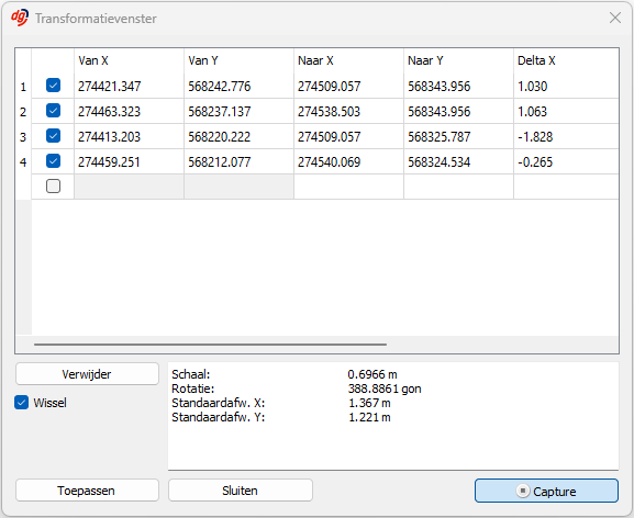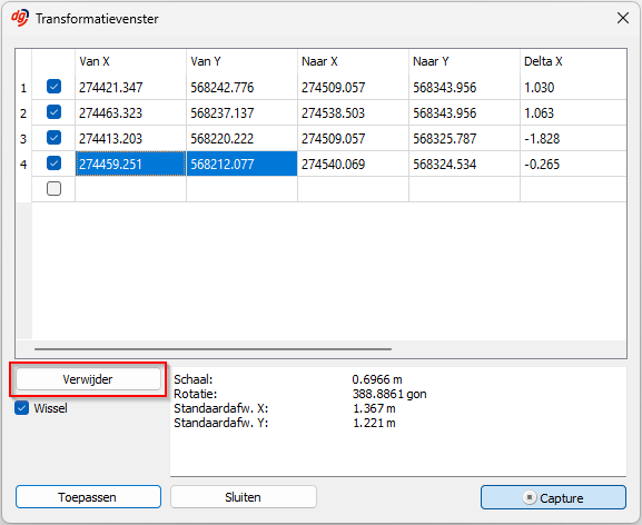 Het is ook altijd mogelijk om aangewezen coördinaten toch niet mee te laten doen met de berekening, door ze aan te vinken en op de knop ‘Verwijderen’ te klikken.